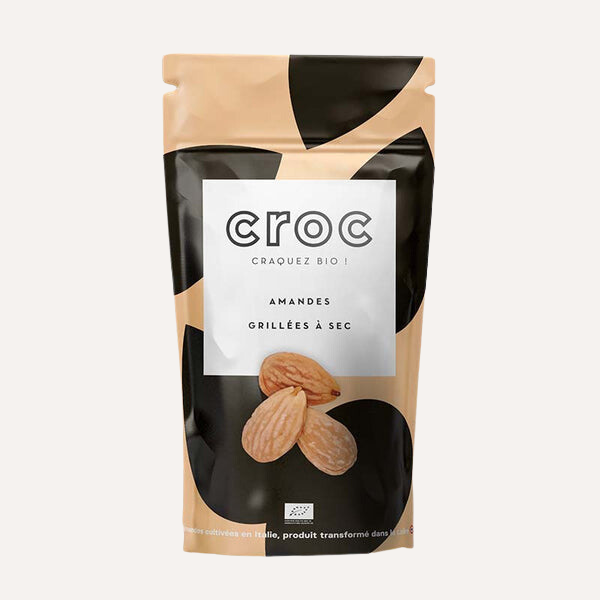 Les amandes Croc sont des fruits secs biologiques délicatement torréfiées. Croc propose des produits sans engrais, sans pesticides, et sans insecticides. Le packaging refermable vous permettra de les protéger comme il se doit.