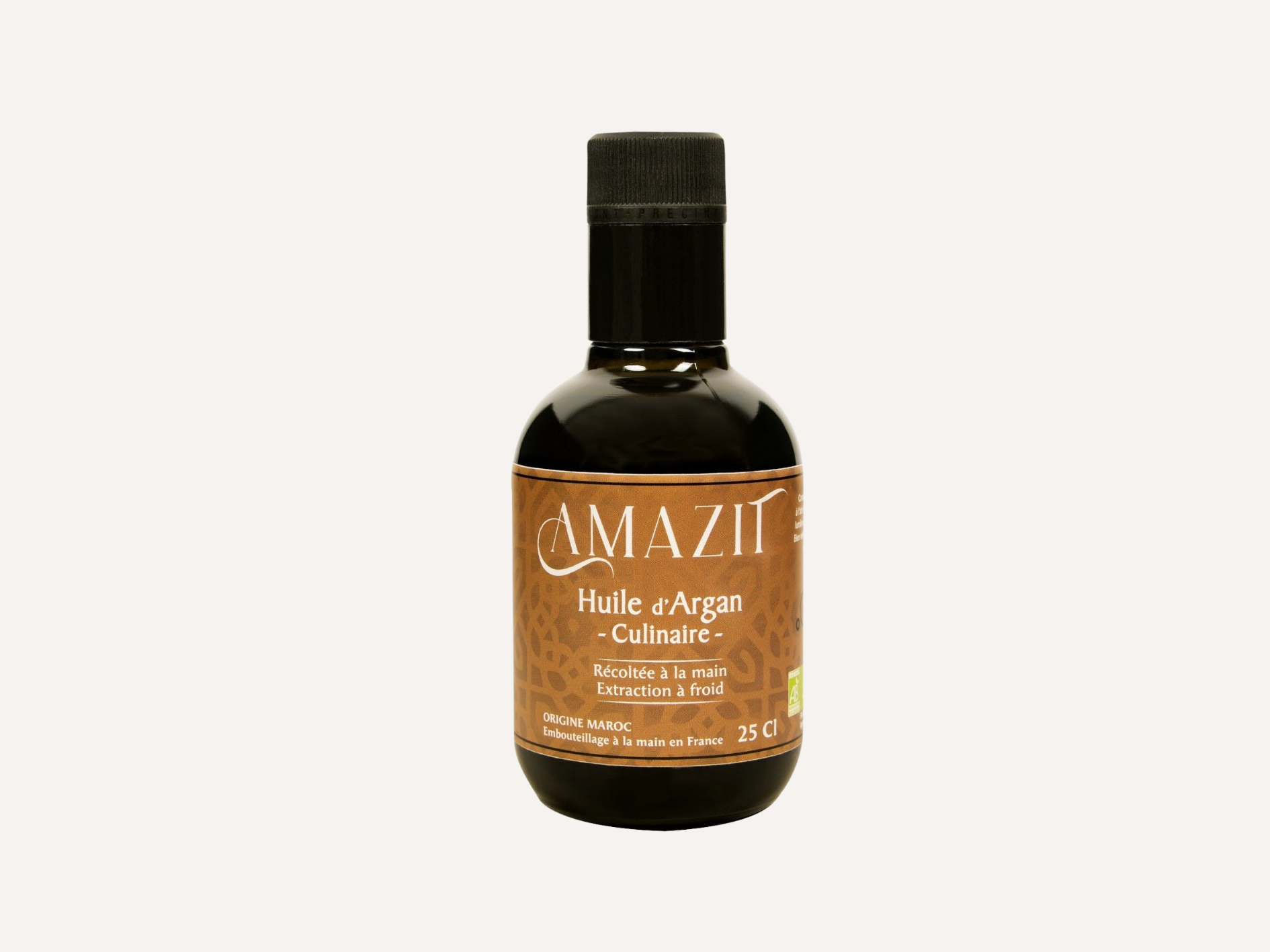 L’Huile Vierge d'Argan Gastronomique Torréfiée Amazit est une huile certifiée IGP (Indication Géographique Protégée) Argane Maroc. Ce procédé de torréfaction lui donne un goût de noisette, ressemblant à l’huile de sésames grillés ou l’huile de noisettes. Cette huile est très appréciée en cosmétique mais également en cuisine.