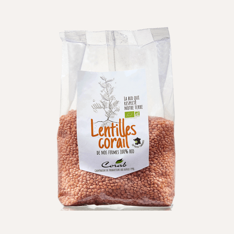 Les lentilles corail Corab Cooperative sont des graines issues de l'agriculture biologique. Riche en fibres, minéraux et protéines végétales, elles sont cultivées et collectées en France, plus précisément en Nouvelle-Aquitaine.