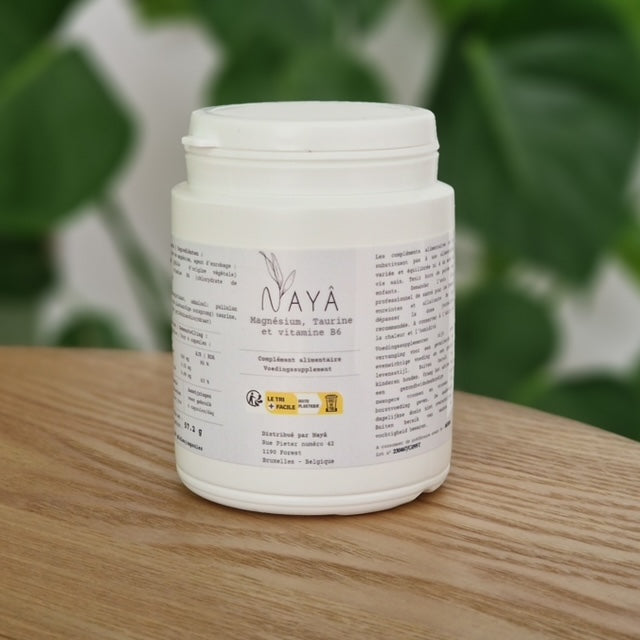 Le magnésium Nayâ Organics est associé à de la vitamine B6 afin de permettre une meilleur assimilation et à de la taurine qui permet la fixation du magnésium au sein de la cellule.